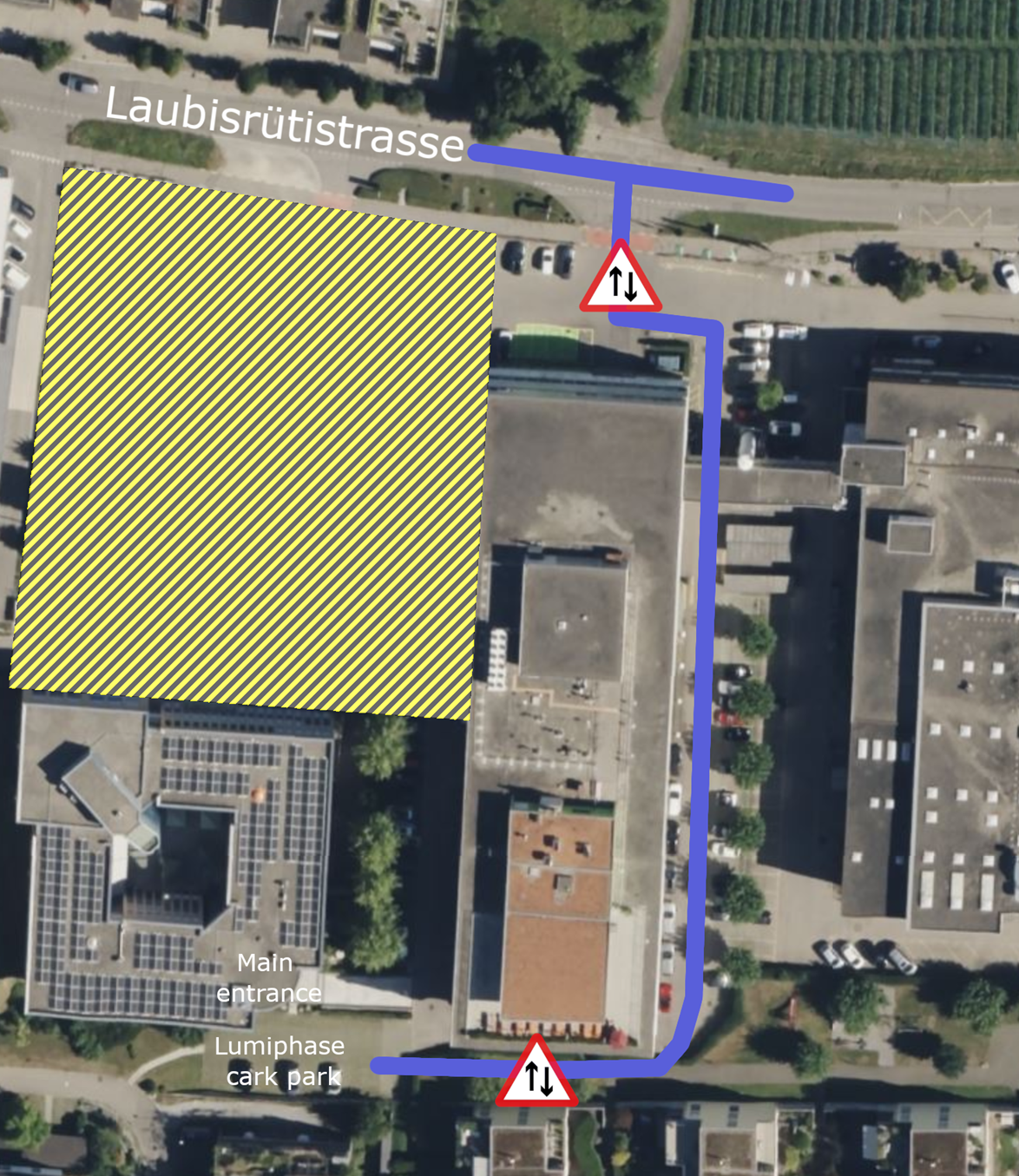 From the main street enter the Sensirion car park (Laubisrütistrasse 50) and turn left and right immediately, passing the Sensirion building on the right. Follow the private road all the way to the back & turn right. The visitor car park and Lumiphase main entrance are located ahead.