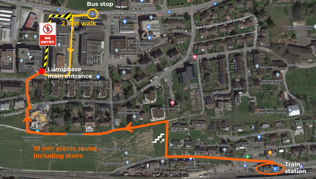 2) Get off at Stäfa train station and take the bus 951 or 955. Operating schedule and further details are available here for the bus 951 and here for the bus 955. The bus station servicing Lumiphase is called Stäfa, Laubisrüti and it is located vis-a-vis our office (2 minutes walk).